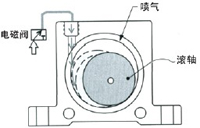 机器内装置一喷气环,喷器环里装有精密滚轴,而平面装有排气孔这耐 冲击塑胶侧盖板,侧盖板上有调节气流之金属膜片,压缩空气通过喷气孔 驱动精密滚轴在喷气环内转动轴在内环回转滚轴重量与运行本体中心的距 离,产生离心力,再透过本体而产生振动。