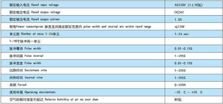 产品特点及功能 ● 可根据清灰要求,调整脉冲等待和脉冲宽度、沉降时间、单元间休、周期、次数等参数,对除尘器实行定时清灰。同时高有 压差控制仪输入接点,接上压差控制仪后可以定压差清灰。 定时/压差工作方式的选择: 按动定时/压差自锁按钮后,相应的定时/压差指示灯有变化:亮为定时工作方式,暗为压差工作方式。 A、当为定时工作方式时,系统上电后会自动运行循环脉冲清灰程序。 B、当为压差工作方式时,系统上电后会自动指向第一路,等待压差信号的接通,一旦有压差信号接通,系统马上就会启动单次 脉冲清灰程序。 ● 本仪器有运行、调整、检查三个功能选项。按动功能按钮,本仪器会在以上三个功能间进行循环: 运行功能:本功能会根据定时/压差工作方式进行相应的运行。 调整功能:本功能进行参数的调整和单元路数的设置。 检查功能:本功能进行单个单元的半自动清灰检查。选择检查功能时,初始单元为零,需按动加1或减1按键选择到相应的单元 上进行检查。按到相应路数时,就启运单次本单元的脉冲清灰程序。 ● 当进行停止时,只需在停止信号端上有停止信号接通后,脉冲清灰程序会根据设定的参数做相应次数的脉冲清灰程序后停止 进行。 ● 印刷线路板上的数码管依次显示箱室号及工作倒计时。 ● 采用专用集成电路简化了线路,节省了器件,提高了控制仪的稳定性和可靠性。 ● 采用全密封塑料外壳,外形美观,防尘性能好。