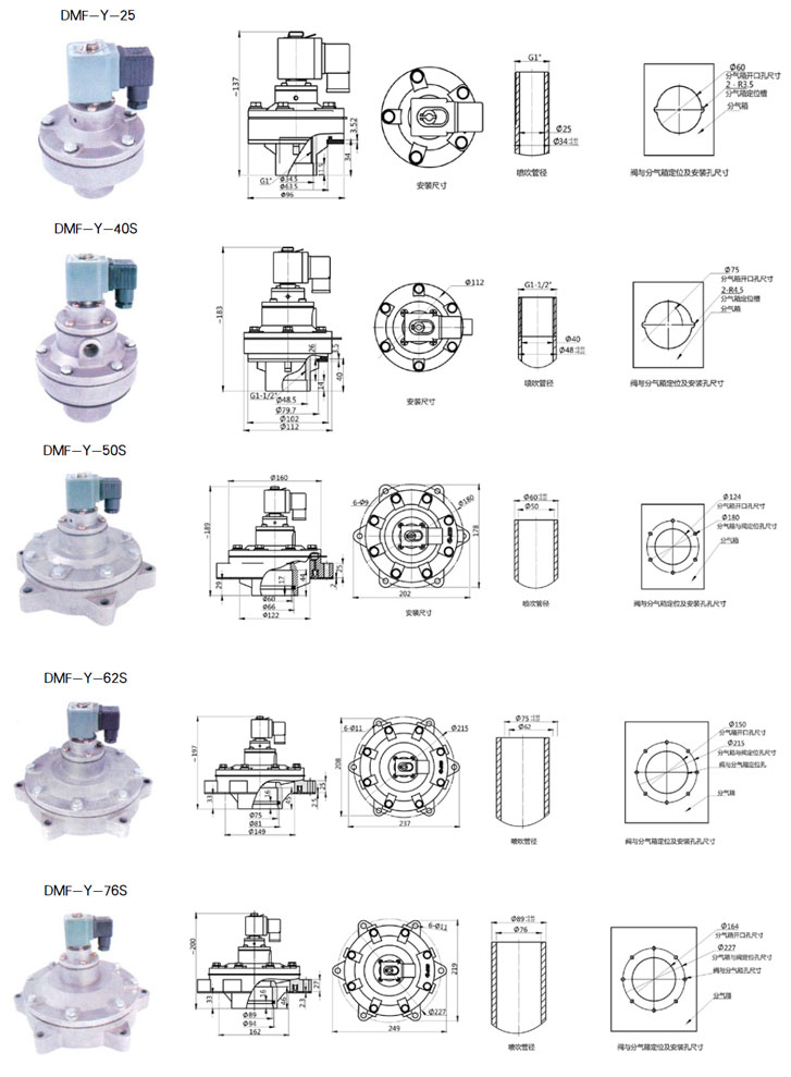 ● D M F-Y型电磁脉冲阀为淹没式阀(亦称嵌入式阀),它直接安装在分气箱上,具有更好的流通特性。压力损失有所下降,适合于气源压力较低的工作场合。
